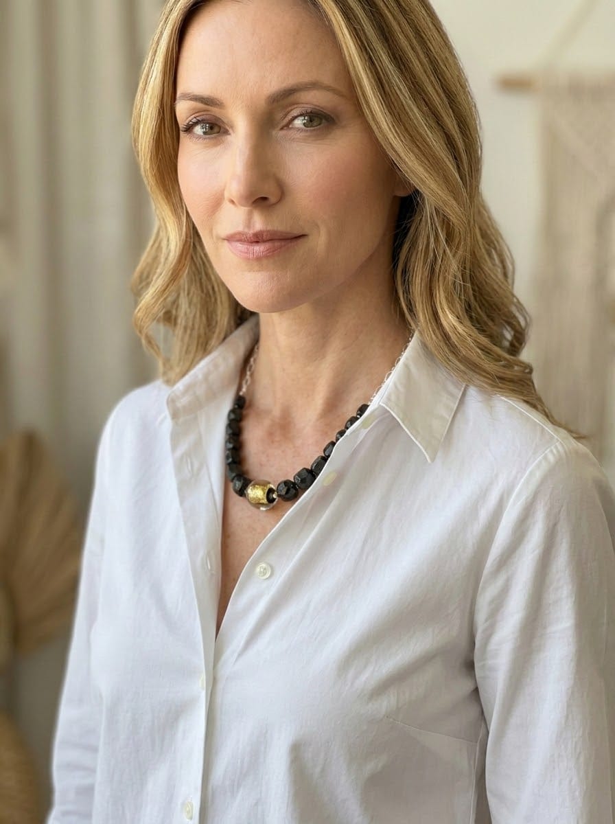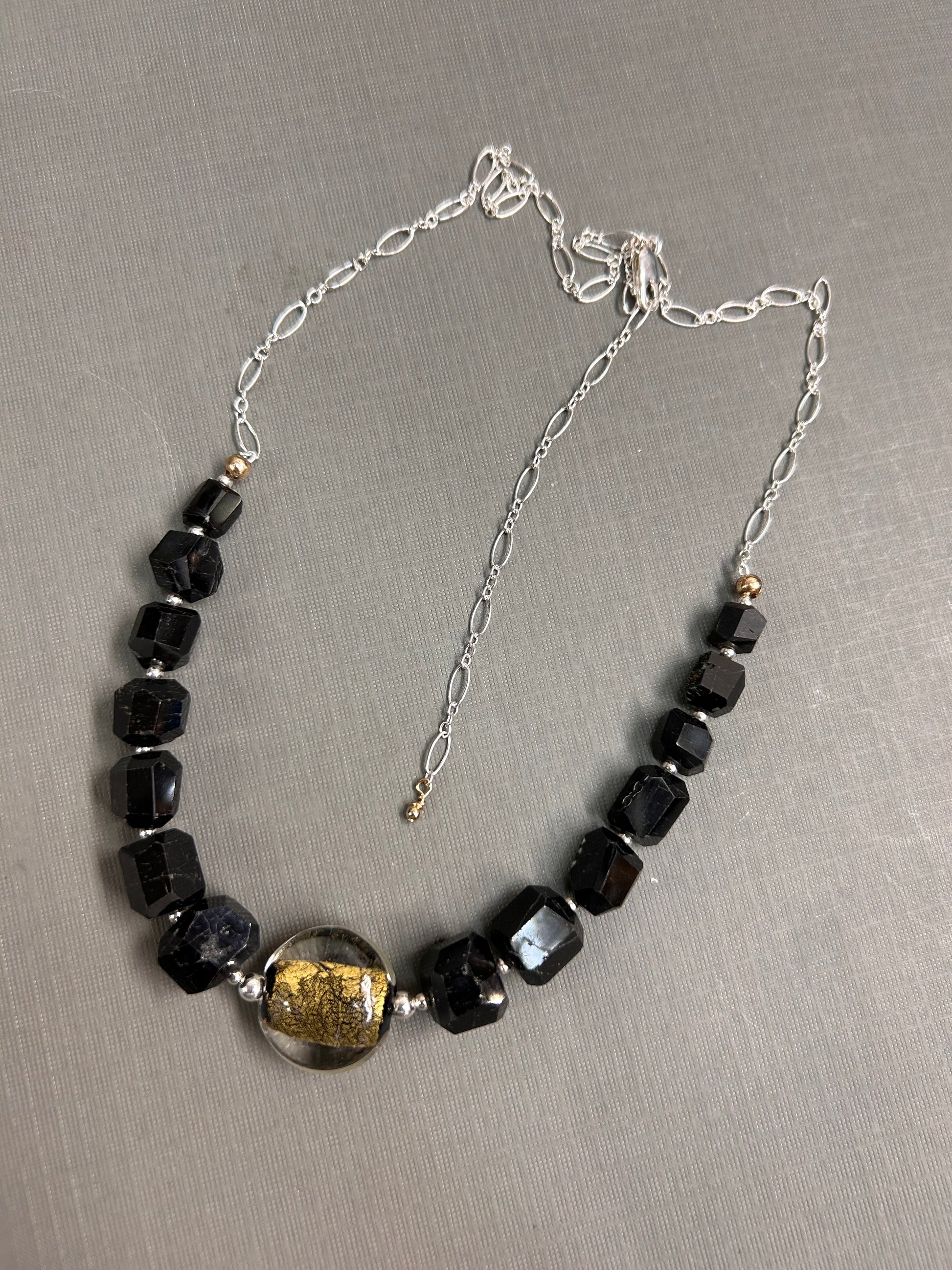 Gorgeous Black Tourmaline necklace with a handmade glass bead in gold.